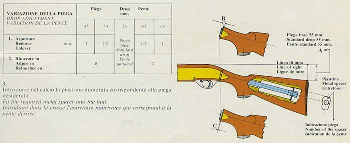 - The stock: of select walnut, hand-checkered; pistol grip with plastic Beretta emblem on bottom flat; plastic butt plate. Standard length 360 mm,; drop variable from 45 to 65 mm. (except on Model A-302 Trap).